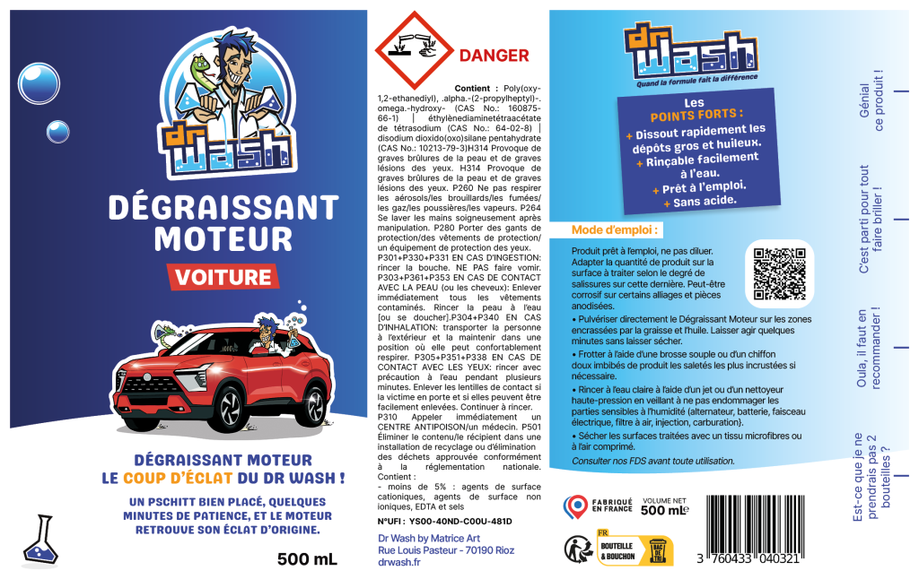 Dr Wash voulait voir ce qu’il y avait sous le capot… mais il a surtout vu de la graisse, de l’huile, et un Sly qui glissait partout. Il a alors concocté un dégraissant moteur puissant et précis, capable de faire place nette sans abîmer les composants.